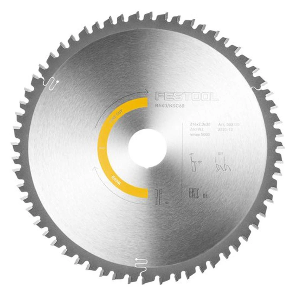 The Festool 576928 miter saw blade features crosscut teeth for clean, splinter-free cross-grain cuts in solid wood and veneered panels. It also works great for coated panels such as melamine. The blade body is made from high-quality steel, while the saw teeth are made from fine-grain carbide. 60 teeth in an ATB tooth pattern. Color coding makes it easier to select the correct saw blade.