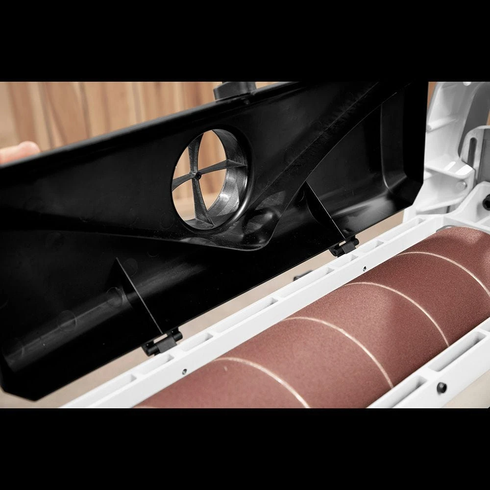 Sand panels up to 32” wide in just two easy passes with the Jet 16-32 Drum Sander. One pass will sand a panel up to 16” wide. Simple tool-free knobs let you adjust the drum parallel to the table to eliminate crowning and unsightly lines in the middle of panels over 16” wide. Variable-speed dial lets you choose the optimal feed rate for a wide range of projects and wood species. Sandsmart technology continuously monitors the load on the drum motor and adjusts the feed rate to prevent overload. The mirrored design of the dust hood optimizes dust flow. Try the Jet Drum Sander today to achieve effortless, professional-quality surfaces.