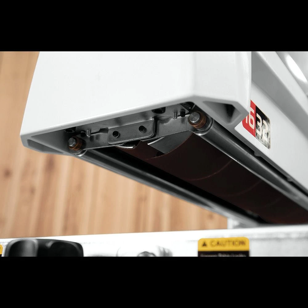 - Redesigned conveyor system pulls the workpiece through the sander instead of pushing