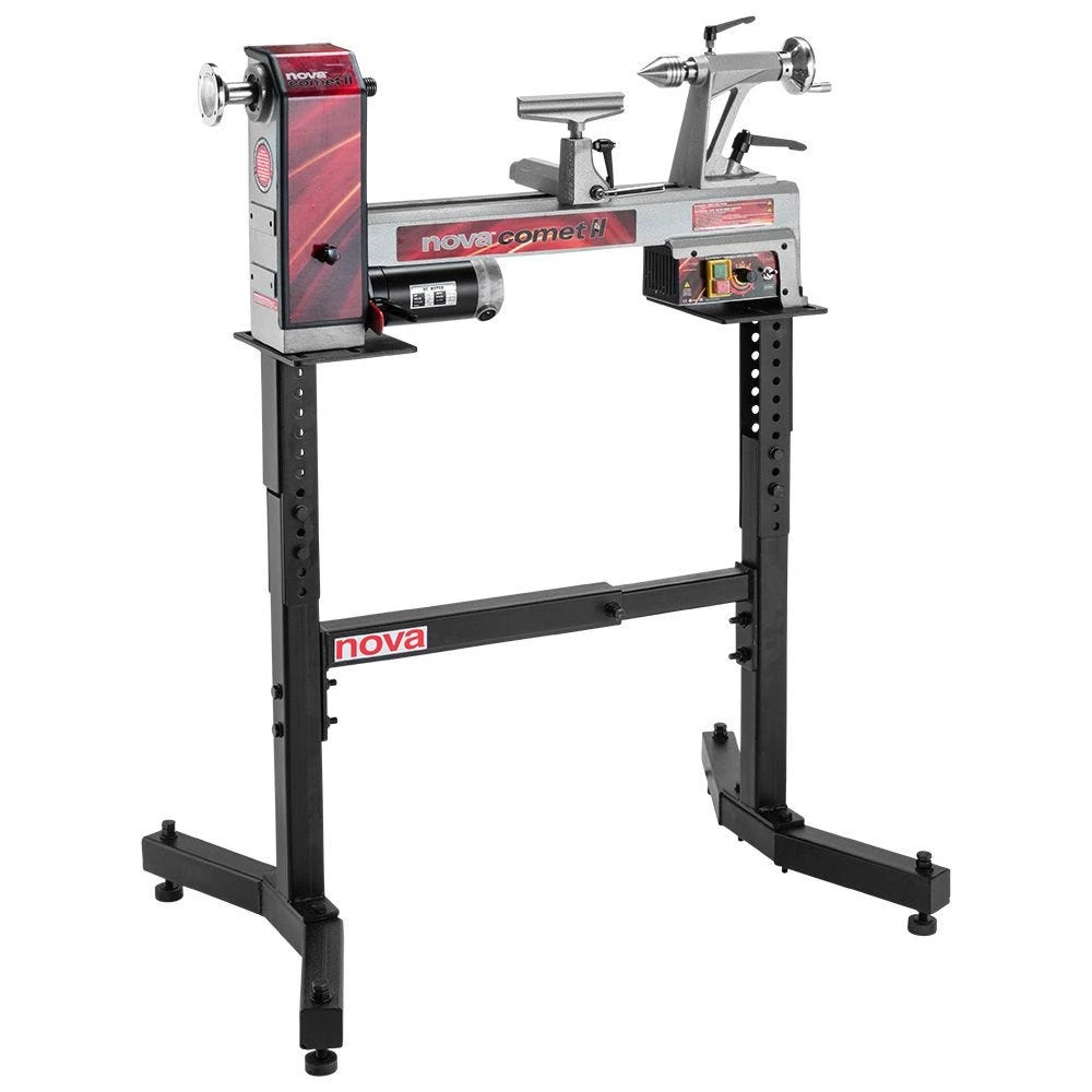 The Comet II Lathe Stand provides a stable, no-nonsense turning station for your Comet II or 14DR lathe. It is built from rugged square steel tubing for rigidity, then finished with a hardwearing powder coat that promises durability and protection from corrosion. It is adjustable in width, depth and height, ensuring a good fit with your lathe, and a comfortable working height. The specially-designed V-shaped foot brackets open up at both the front and rear of the lathe, providing more foot room as you work along the length of your lathe. Use the included leveling feet to attain a flat, stable surface, or install your own casters to provide mobility if desired.