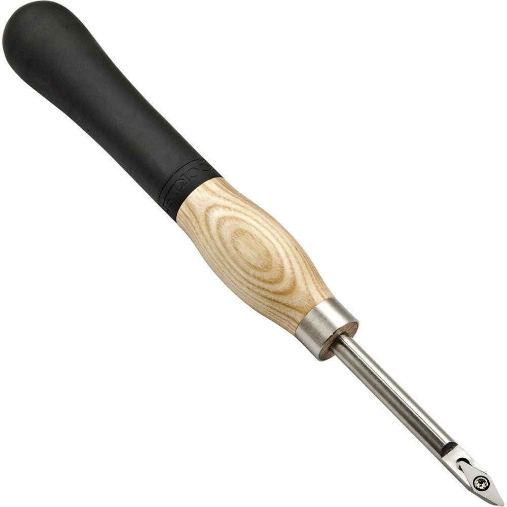 This Diamond Carbide Mini Turning Tool from Rockler features a replaceable and rotatable cutter that eliminates the hassle and downtime of sharpening. Simply rotate the carbide cutter for a fresh, sharp edge, and replace it once all available edges have grown dull. The solid carbide cutter also stays sharp for longer when compared with steel, giving you a much longer useful life. Shaft features a flattened back for stability when using the tool rest. The handles are made of solid ash encased with a thick, molded rubber end for an enhanced grip and reduced fatigue.