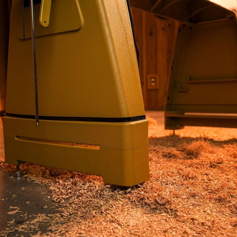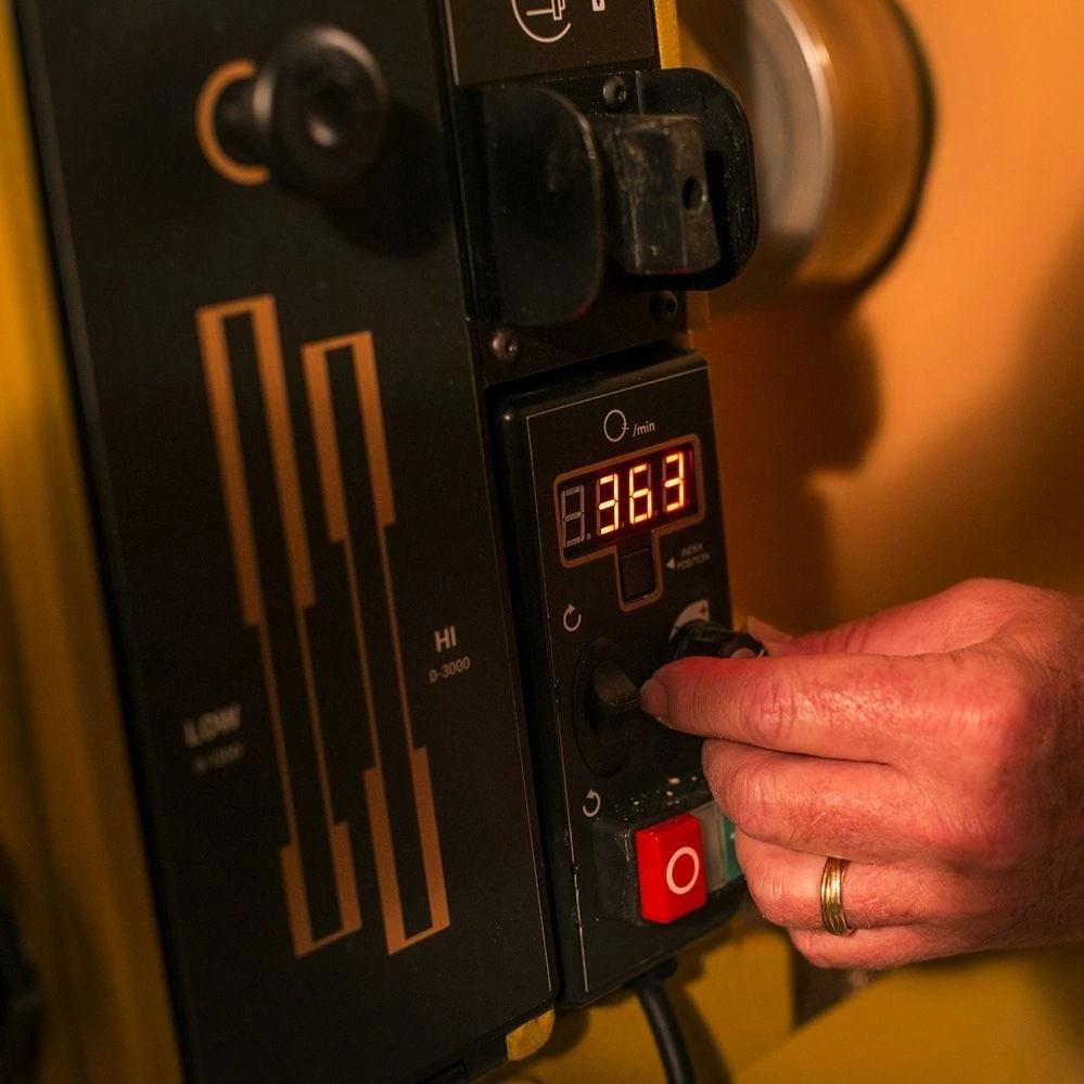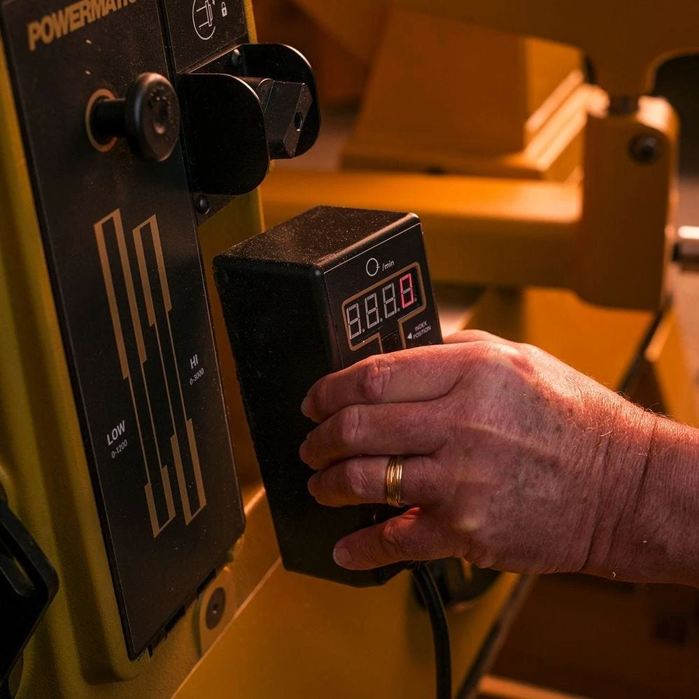The Powermatic® 3520C adds numerous innovative features to the already well-loved 3520 lineup. New features include an easily moveable magnetic control box that can be attached almost anywhere on the lathe for the most convenient access, adjustable riser blocks for 6” or more of height adjustment and an increased weight of 726 pounds for maximum rigidity and minimal vibration. The easy-to-read digital indexing speed readout makes adjustments as easy as turning a dial. Electronic variable speed with low and high speed ranges ensures excellent versatility, and since the lathe is capable of maintaining an incredibly low speed of 15 RPM, it is ideal for large turnings. Other features include the new ergonomic spindle lock design, an anti-rotation tailstock key, a set of dead centers that hold a spindle for visual comparison, a two position mount for the optional bed extension, and a sliding hammer knockout rod with brass tip.