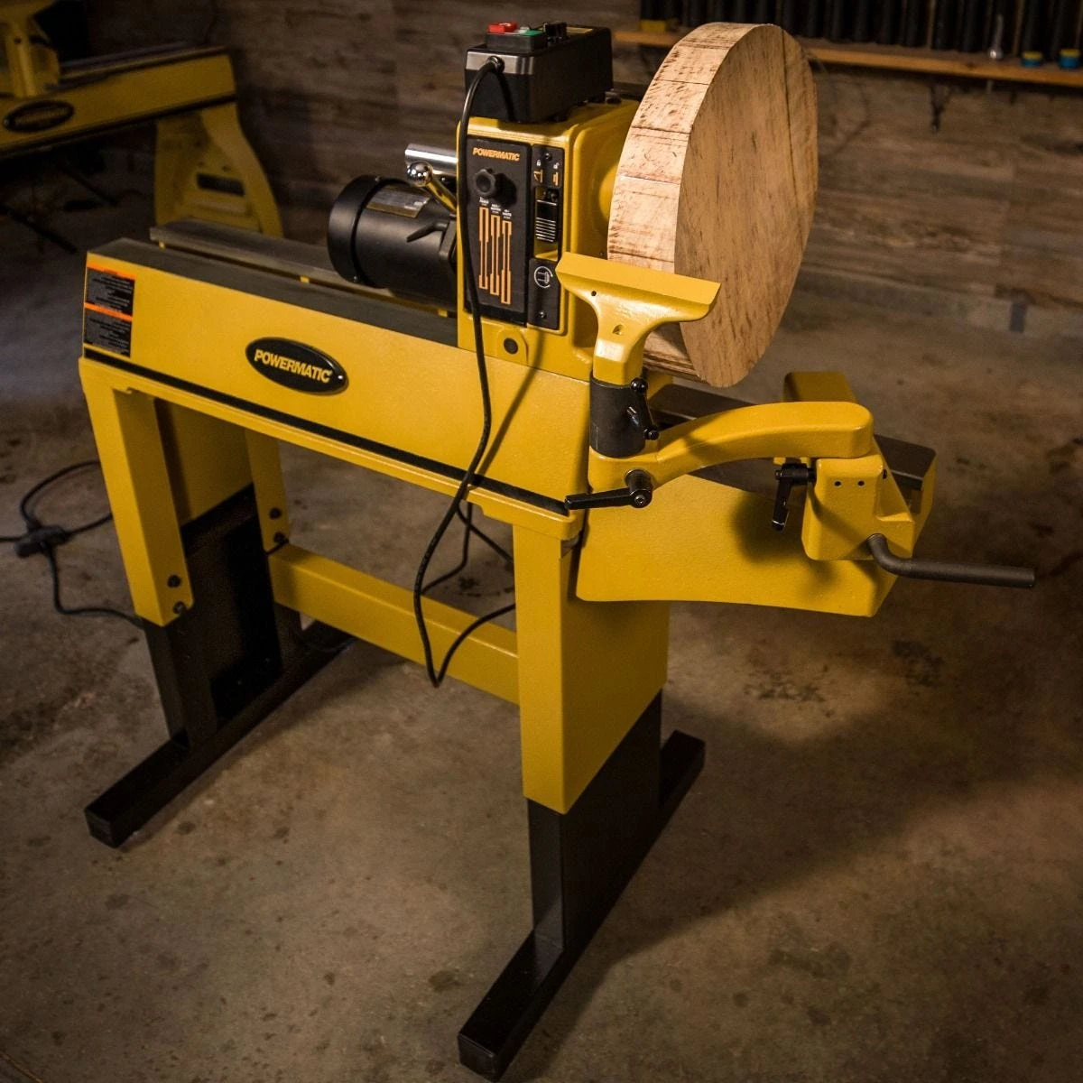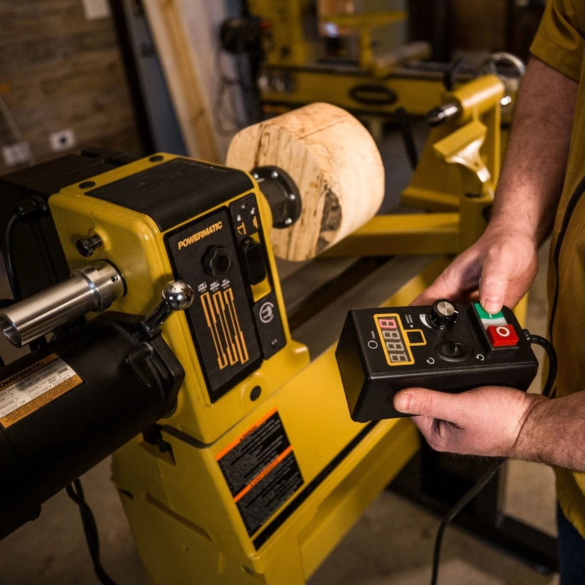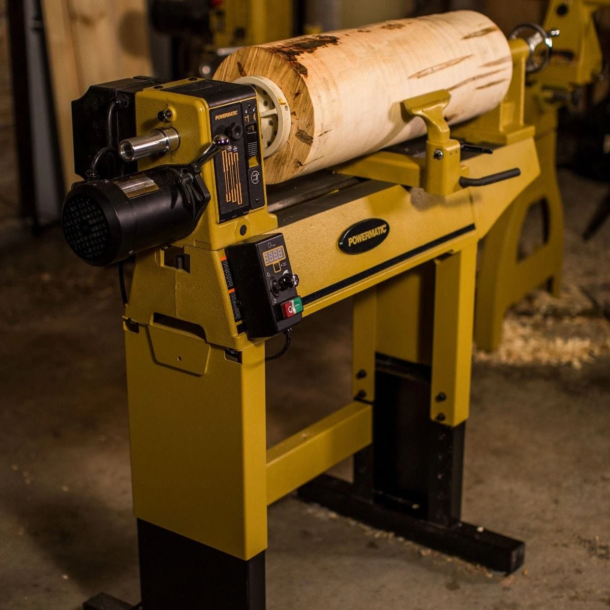 The Powermatic PM2014 Lathe features a phase inverter that powers its 3-phase motor on a common 115V receptacle. That means you get commercial-grade power in a consumer shop, or wherever else you can find an outlet. The motor’s abundant torque is consistent, even at speeds as low as 15 RPM. From spindles and table legs to bowls and other hollow forms, the PM2014 is a steadfast, capable performer. The 1HP motor can turn large work within three variable speed ranges: 15-900 RPM, 30-1,800 RPM and 60-3,600 RPM. The control box clearly displays your spindle speed (and indexing positions), and is magnetically mounted so you can easily move it to suit your turning operation. The 24 indexing positions let you locate repeated features, such as flutes and inlays, around the perimeter of the turning. This model includes a stand, which offers a full 12” of height adjustability, from 34” to 46”. The lathe is also available as a benchtop model (#65742, sold separately).