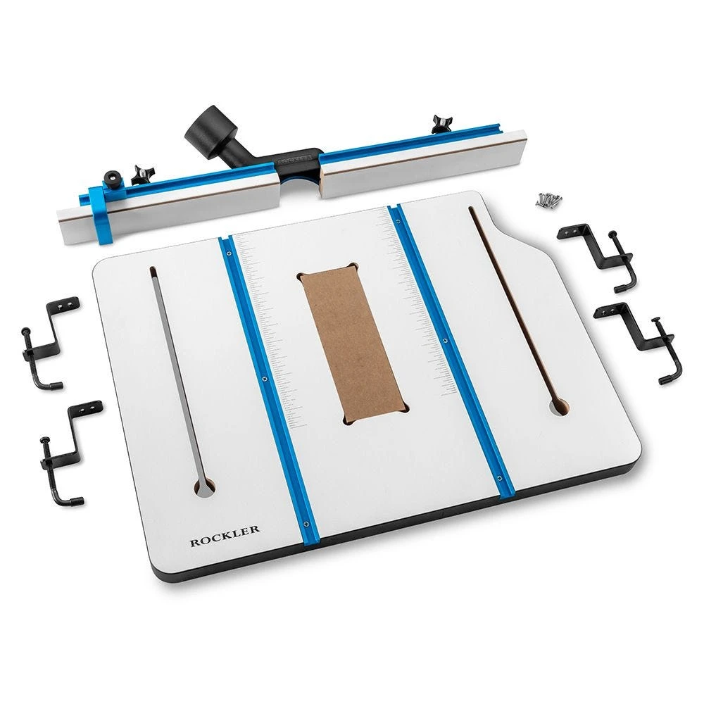 - Extruded aluminum fence features adjustable MDF faces that let you straddle large Forstner bits and sanding spindles