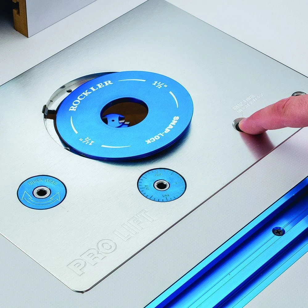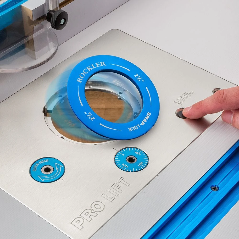 Two patent-pending features raise the Rockler Pro Lift into a class of its own: ultra-fast ”Quick-Gear” height adjustments and ”Snap-Lock” tool-free insert ring changes. Push the button to release the insert ring, then wind the Quick-Gear to raise the bit above the table in just seconds. Once the bit is installed, quickly lower it, click in the insert ring, and use the fine adjustment gear to set the final height to within 0.001”. All this is achieved more quickly, more efficiently, and more intuitively with the Rockler Pro Lift. Raise your woodworking to a new level.